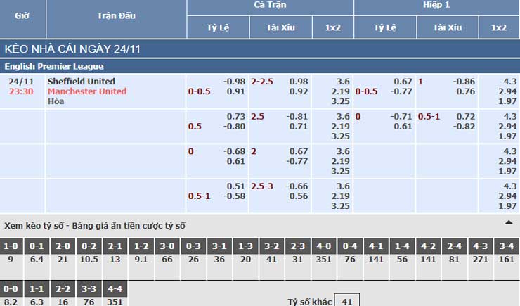 Bảng tỷ lệ kèo nhà cái trận Sheffield United vs Manchester United